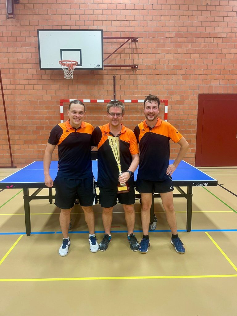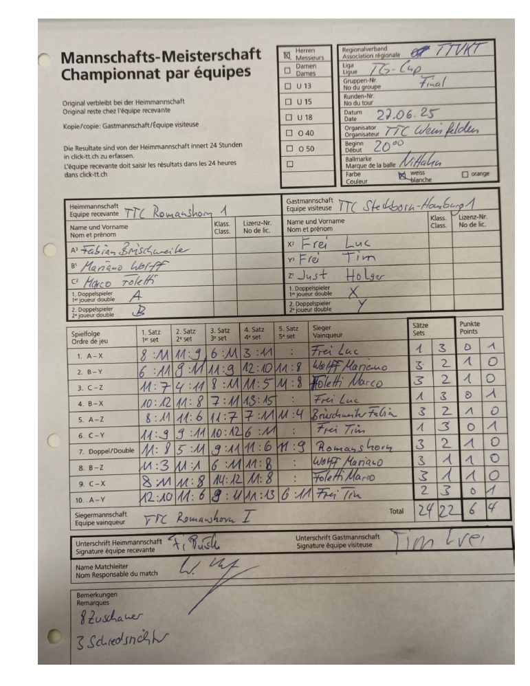 Romanshorn 1 gewinnt auch in diesem Jahr den TG-Cup. Mariano (B11) , Marco (B11) und Fabian (C10) konnten die Gegner aus Steckborn , Luc (C10) , Tim (C9) und Holger (C8) , mit 6:4 schlagen. Es war eine extrem enge Geschichte und der Ausgang des Matches wurde erst im letzten Spiel zugunsten von Romanhorn entschieden. Herzliche Gratulation ! ! ! 💪🏓🏆